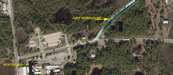 | FROM KEATON BEACH - GO SOUTH ON CR361 TO STEINHATCHEE TURN LEFT ON JODY MORGAN RD (about 700 feet) |