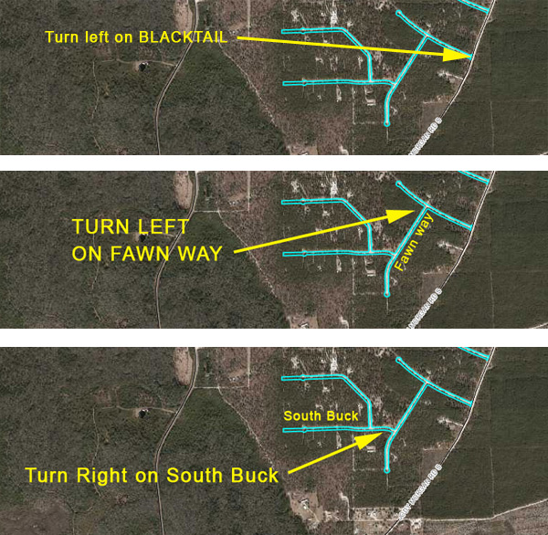 Travel 1.6 MILES TO THE FIRST ROAD ON THE LEFT, BLACKTAIL. TURN LEFT AND TRAVEL 300 FT. TO THE NEXT ROAD ON THE LEFT. TURN LEFT ON FAWN WAY & TRAVEL 900FT TO THE FIRST RIGHT SOUTH BUCK COURT